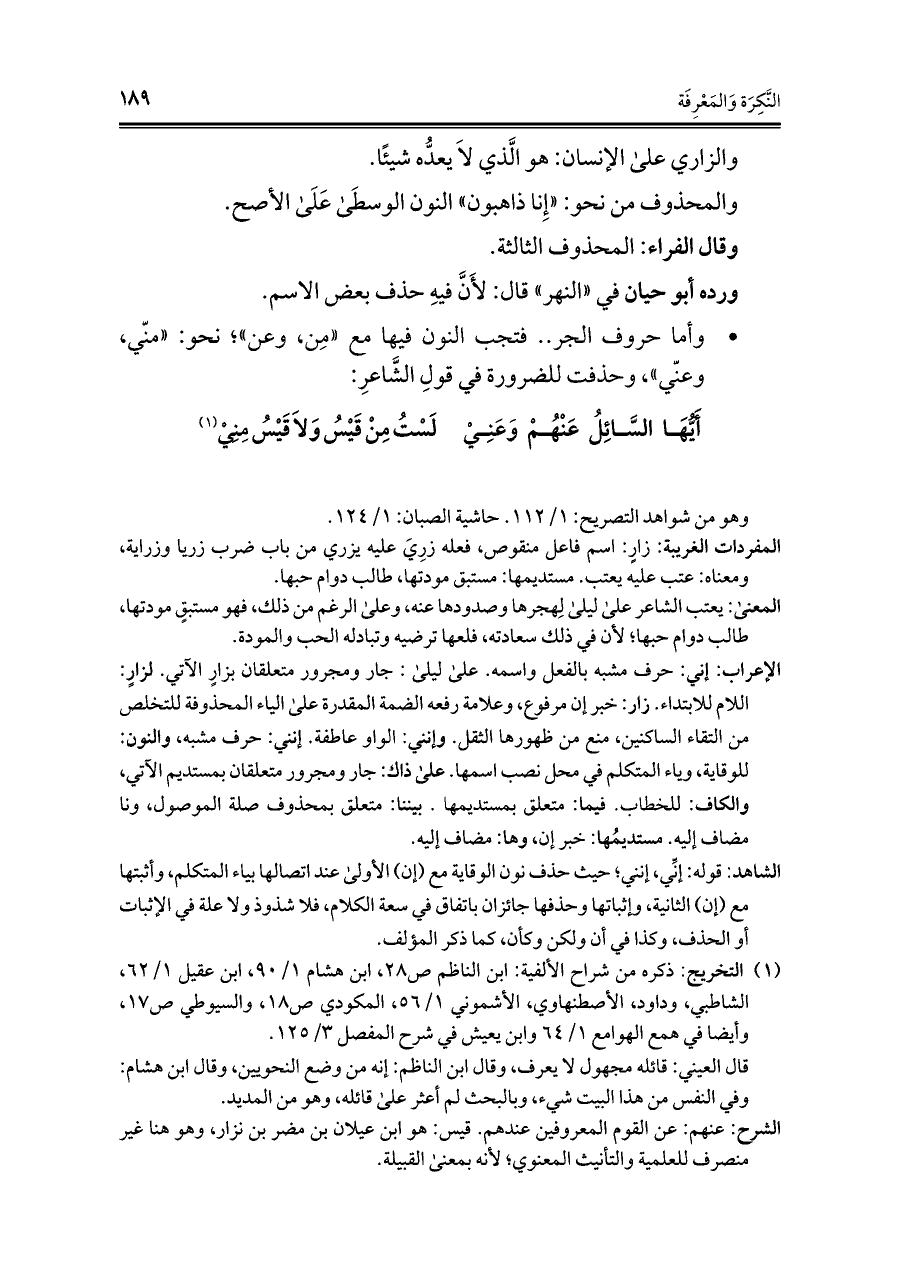 الشاهد: قوله: إنِّي، إنني؛ حيث حذف نون الوقاية مع (إن) الأولى عند اتصالها بياء المتكلم، وأثبتها مع (إن) الثانية، وإثباتها وحذفها جائزان باتفاق في سعة الكلام، فلا شذوذ ولا علة في الإثبات أو الحذف، وكذا في أن ولكن وكأن، كما ذكر المؤلف.