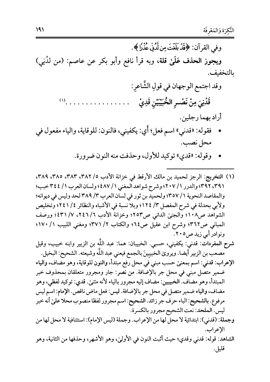 الشاهد: قوله: قدني وقدي؛ حيث أثبت النون في الأولى، وهو الأشهر، وحذفها من الثانية، وهو قليل.