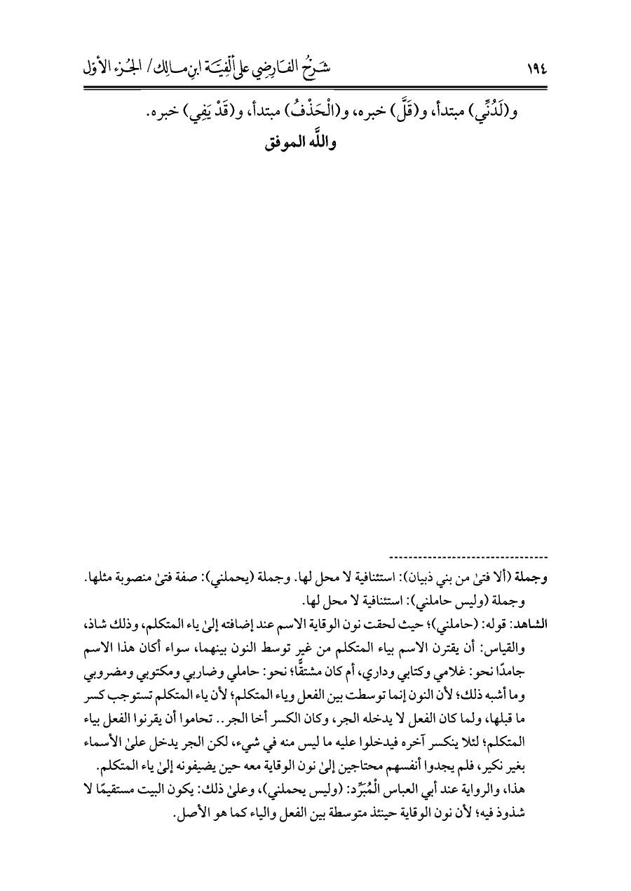 الشاهد: قوله: (حاملني)؛ حيث لحقت نون الوقاية الاسم عند إضافته إلى ياء المتكلم، وذلك شاذ، والقياس: أن يقترن الاسم بياء المتكلم من غير توسط النون بينهما، سواء أكان هذا الاسم جامدًا نحو: غلامي وكتابي وداري، أم كان مشتقًّا؛ نحو: حاملي وضاربي ومكتوبي ومضروبي وما أشبه ذلك؛ لأن النون إنما توسطت بين الفعل وياء المتكلم؛ لأن ياء المتكلم تستوجب كسر ما قبلها، ولما كان الفعل لا يدخله الجر، وكان الكسر أخا الجر .. تحاموا أن يقرنوا الفعل بياء المتكلم؛ لئلا ينكسر آخره فيدخلوا عليه ما ليس منه في شيء، لكن الجر يدخل على الأسماء بغير نكير، فلم يجدوا أنفسهم محتاجين إلى نون الوقاية معه حين يضيفونه إلى ياء المتكلم. هذا، والرواية عند أبي العباس الْمُبَرِّد: (وليس يحملني)، وعلى ذلك: يكون البيت مستقيمًا لا شذوذ فيه؛ لأن نون الوقاية حينئذ متوسطة بين الفعل والياء كما هو الأصل.