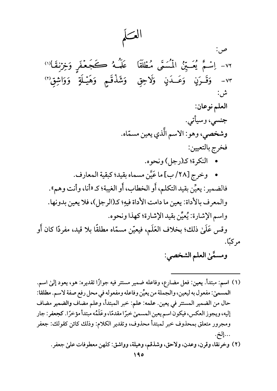 ٧٢ - اِسْمٌ يُعَيِّنُ الْمُسَمَّى مُطْلَقَا ... عَلَمُهُ كَجَعْفَرٍ وَخِرْنِقَا (¬١)