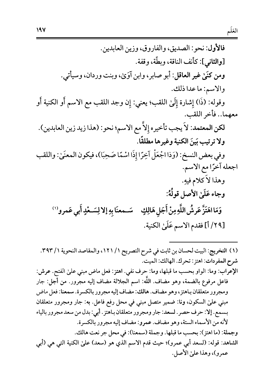 الشاهد: قوله: (لسعد أبي عمرو)؛ حيث قدم الاسم الذي هو (سعد) على الكنية التي هي (أبي عمرو)، وهذا على الأصل.