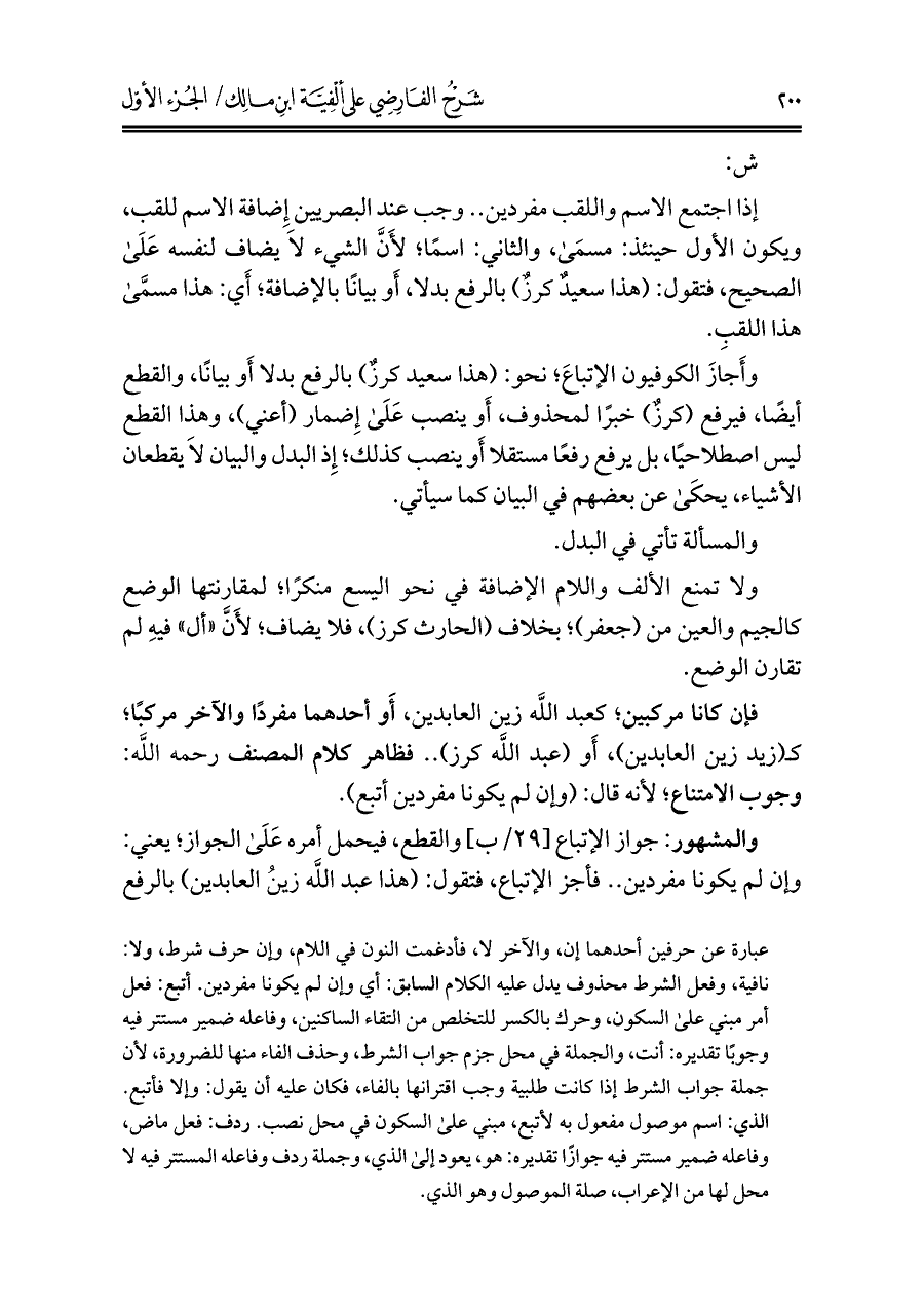 فإن كانا مركبين؛ كعبد اللَّه زين العابدين، أَو أحدهما مفردًا والآخر مركبًا؛ كـ (زيد زين العابدين)، أَو (عبد اللَّه كرز) .. فظاهر كلام المصنف رحمه اللَّه: وجوب الامتناع؛ لأنه قال: (وإن لم يكونا مفردين أتبع).
