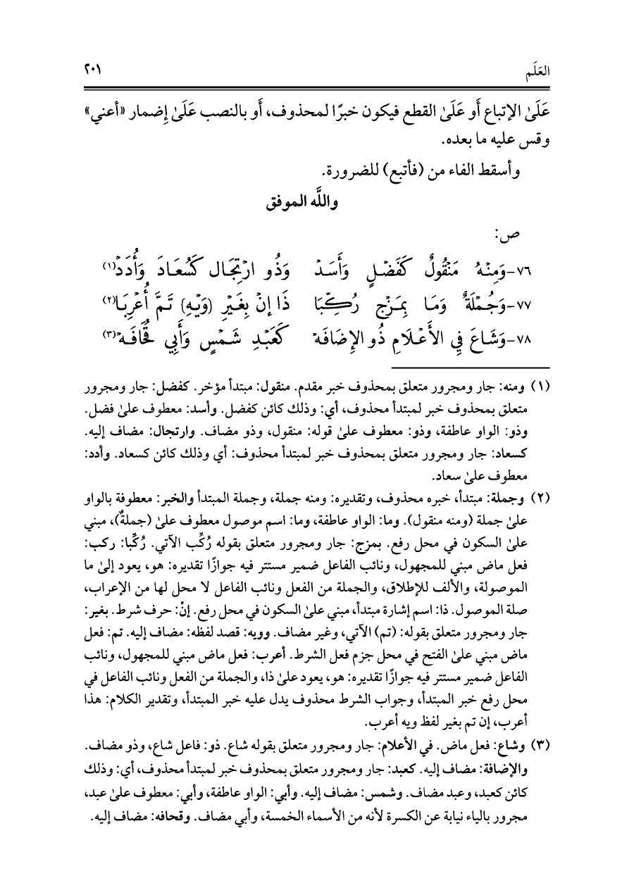 (¬١) ومنه: جار ومجرور متعلق بمحذوف خبر مقدم. منقول: مبتدأ مؤخر. كفضل: جار ومجرور متعلق بمحذوف خبر لمبتدأ محذوف، أي: وذلك كائن كفضل. وأسد: معطوف على فضل. وذو: الواو عاطفة، وذو: معطوف على قوله: منقول، وذو مضاف. وارتجال: مضاف إليه. كسعاد: جار ومجرور متعلق بمحذوف خبر لمبتدأ محذوف: أي وذلك كائن كسعاد. وأدد: معطوف على سعاد.