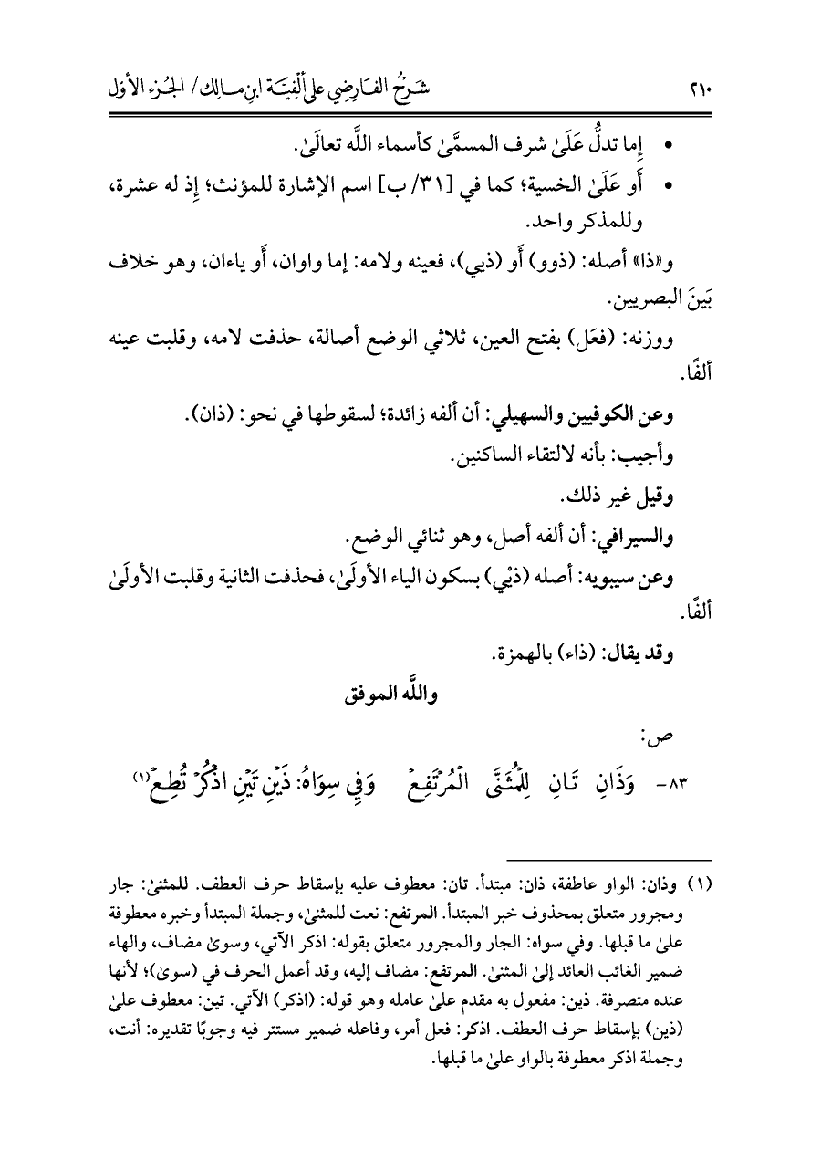 (¬١) وذان: الواو عاطفة، ذان: مبتدأ. تان: معطوف عليه بإسقاط حرف العطف. للمثنى: جار ومجرور متعلق بمحذوف خبر المبتدأ. المرتفع: نعت للمثنى، وجملة المبتدأ وخبره معطوفة على ما قبلها. وفي سواه: الجار والمجرور متعلق بقوله: اذكر الآتي، وسوى مضاف، والهاء ضمير الغائب العائد إلى المثنى. المرتفع: مضاف إليه، وقد أعمل الحرف في (سوى)؛ لأنها عنده متصرفة. ذين: مفعول به مقدم على عامله وهو قوله: (اذكر) الآتي. تين: معطوف على (ذين) بإسقاط حرف العطف. اذكر: فعل أمر، وفاعله ضمير مستتر فيه وجوبًا تقديره: أنت، وجملة اذكر معطوفة بالواو على ما قبلها.
