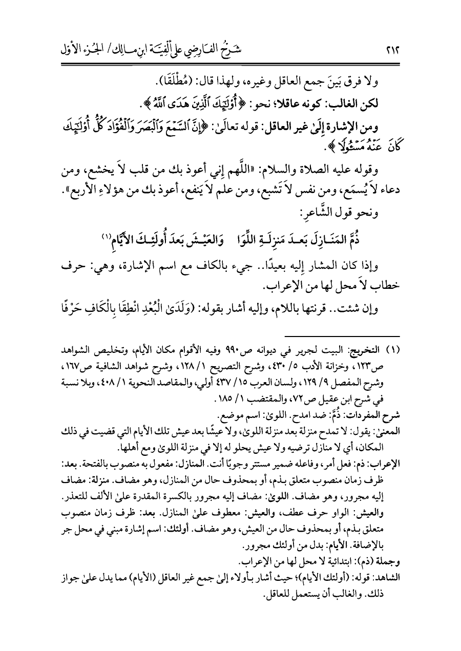 الشاهد: قوله: (أولئك الأيام)؛ حيث أشار بأولاء إلى جمع غير العاقل (الأيام) مما يدل على جواز ذلك. والغالب أن يستعمل للعاقل.