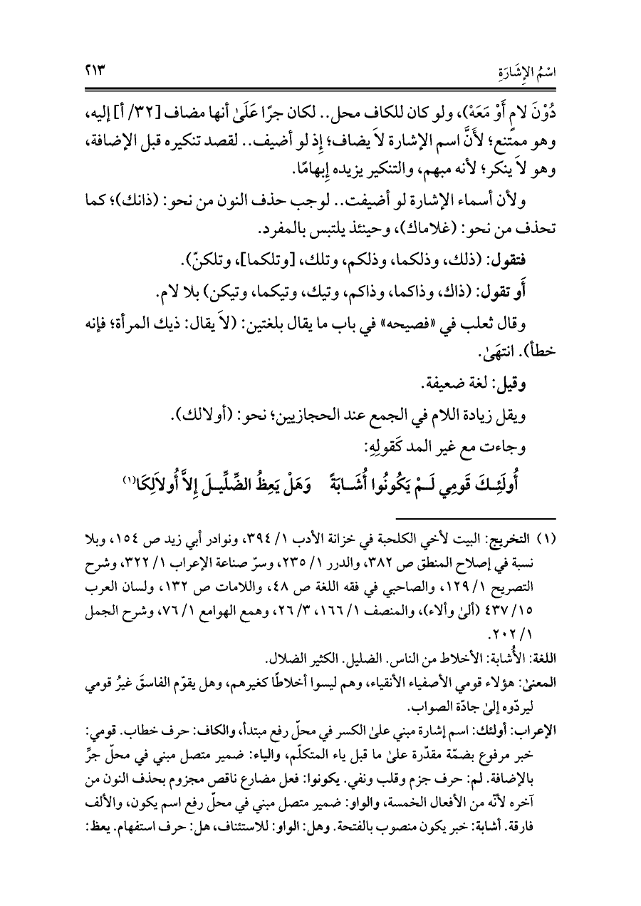 ويقل زيادة اللام في الجمع عند الحجازيين؛ نحو: (أولالك).