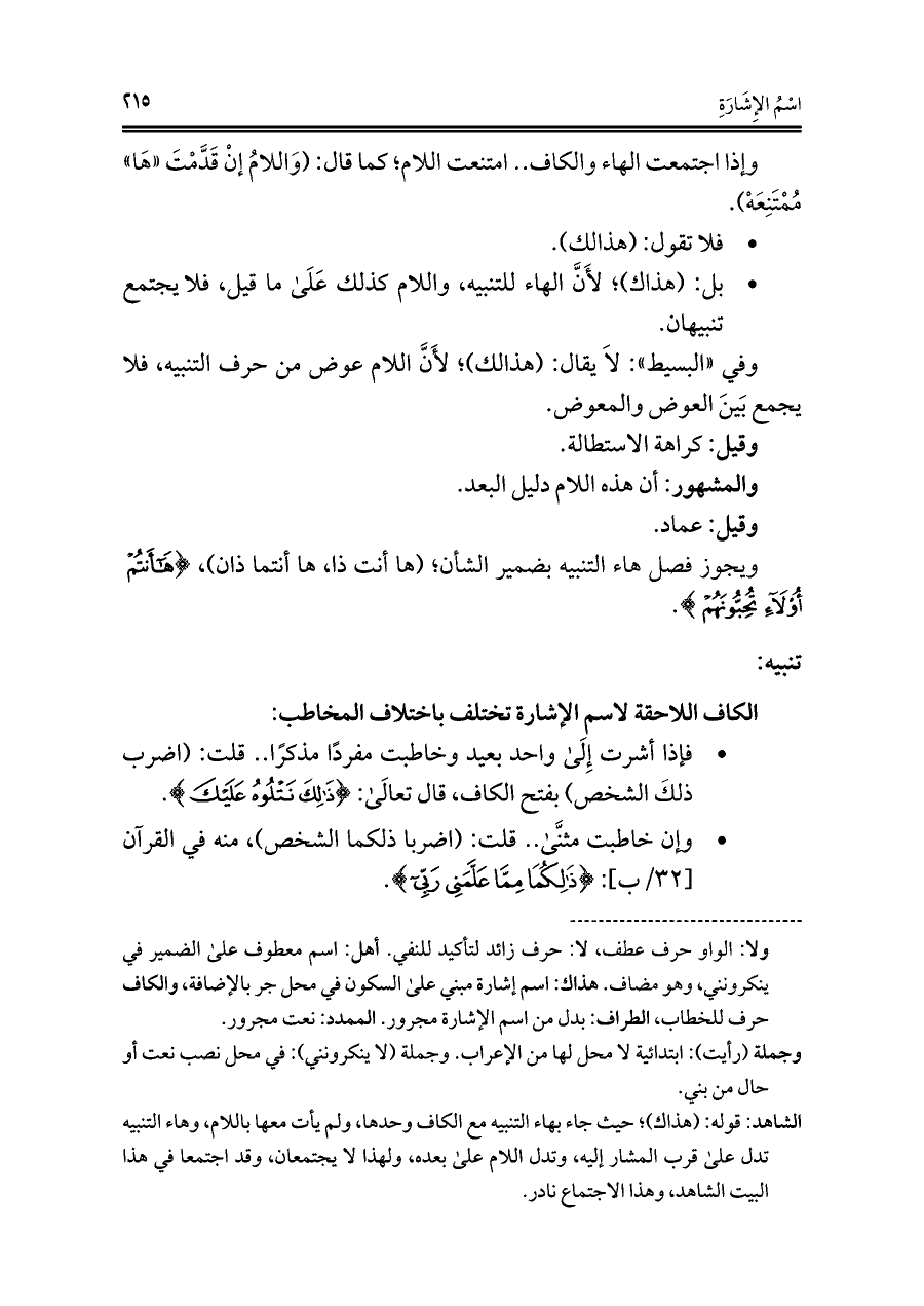 * فإذا أشرت إِلَى واحد بعيد وخاطبت مفردًا مذكرًا .. قلت: (اضرب ذلكَ الشخص) بفتح الكاف، قال تعالَى: {ذَلِكَ نَتْلُوهُ عَلَيْكَ}.