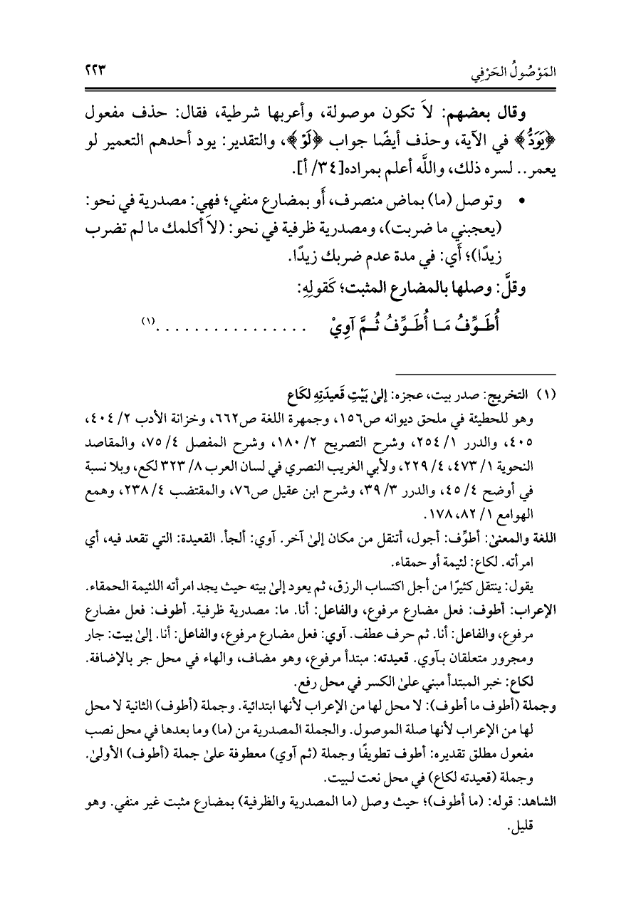 الشاهد: قوله: (ما أطوف)؛ حيث وصل (ما المصدرية والظرفية) بمضارع مثبت غير منفي. وهو قليل.