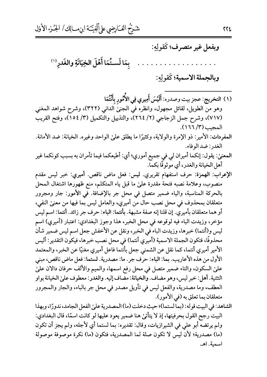 الإعراب: الهمزة: حرف استفهام تقريري. ليس: فعل ماض ناقص. أميري: خبر ليس مقدم منصوب، وعلامة نصبه فتحة مقدرة على ما قبل ياء المتكلم، منع ظهورها اشتغال المحل بالحركة المناسبة، والياء ضمير متصل في محل جر بالإضافة. في الأمور: جار ومجرور متعلقان بمحذوف في محل نصب حال من أميري، والعامل ليس بما فيها من معنى النفي، أو هما متعلقان بأميري. إن قلنا إنه صفة مشبهة. بأنتما: الباء: حرف جر زائد. أنتما: اسم ليس مؤخر، وزيدت الباء فيه لوقوعه في محل الخبر، هذا وجوز البغدادي: اعتبار (أميري) اسم ليس و (أنتما) خبرها، وزيدت الباء في الخبر، ونقل عن الأخفش جعل اسم ليس ضمير شأن محذوفًا، فتكون الجملة الاسمية (أميري أنتما) في محل نصب خبرها، فيكون التقدير: أليس الأمير أميري أنتما، كما نقل عن الشمني جعل بأنتما فاعل أميري مغنيًا عن الخبر، والمعتمد الأول من هذه الأعاريب. بما: الباء: حرف جر. ما: مصدرية. لستما: فعل ماض ناقص، مبني على السكون، والتاء ضمير متصل في محل رفع اسمها، والميم والألف حرفان دالان على التثنية. أهل: خبر ليس، وهو مضاف. والخيانة: مضاف إليه. والغدر: معطوف على الخيانة بواو العطف، وما مصدرية، والفعل ليس في تأويل مصدر في محل جر بالباء، والجار والمجرور متعلقان بما تعلق به (في الأمور).