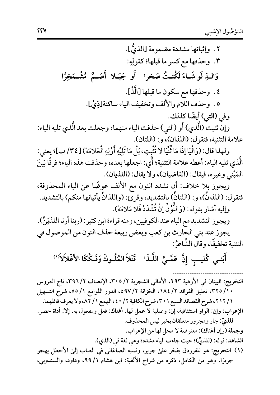 الشاهد: قوله: (للذيِّ)؛ حيث جاءت الياء مشددة وهي لغة في (الذي).