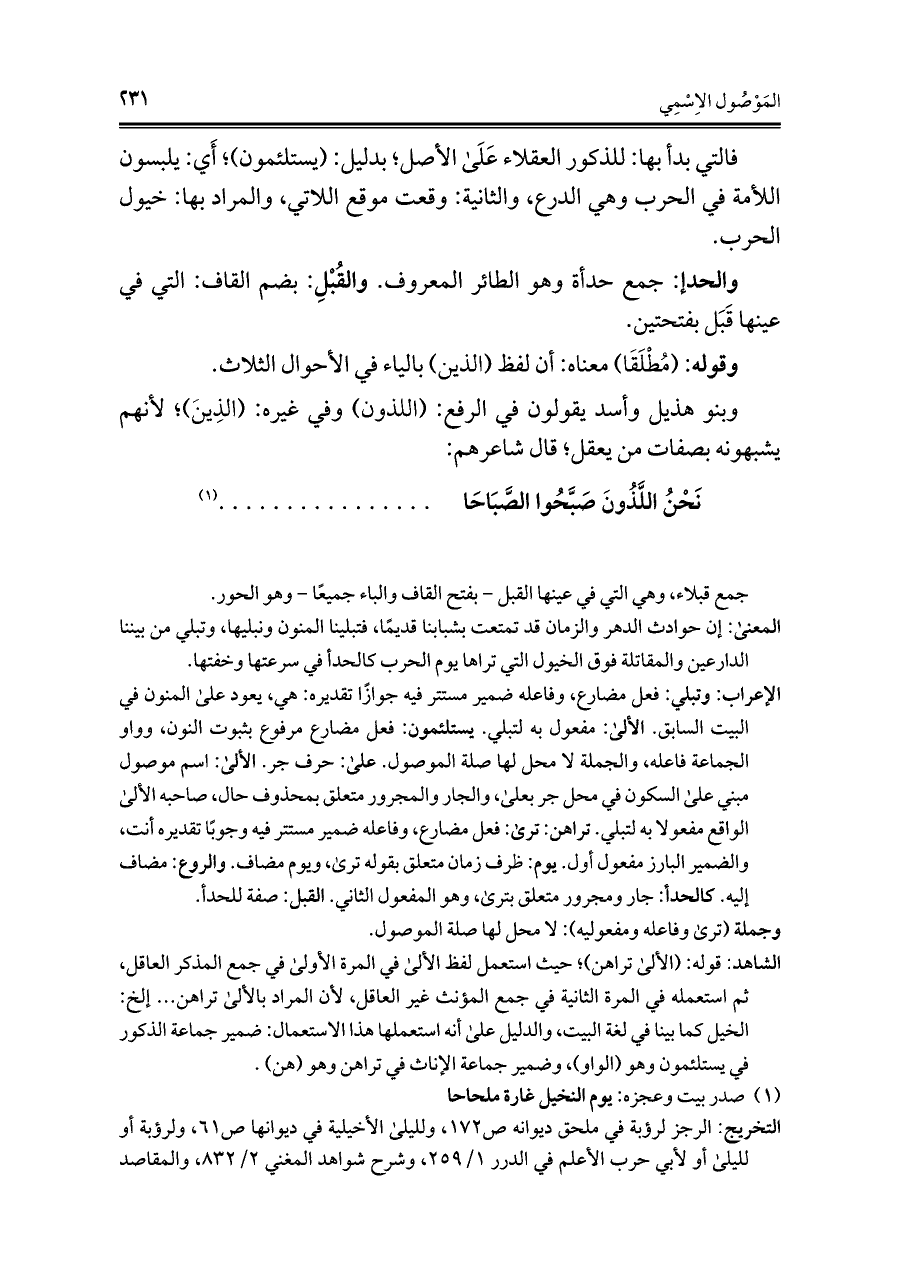 الشاهد: قوله: (الألى تراهن)؛ حيث استعمل لفظ الألى في المرة الأولى في جمع المذكر العاقل، ثم استعمله في المرة الثانية في جمع المؤنث غير العاقل، لأن المراد بالألى تراهن ... إلخ: الخيل كما بينا في لغة البيت، والدليل على أنه استعملها هذا الاستعمال: ضمير جماعة الذكور في يستلئمون وهو (الواو)، وضمير جماعة الإناث في تراهن وهو (هن).