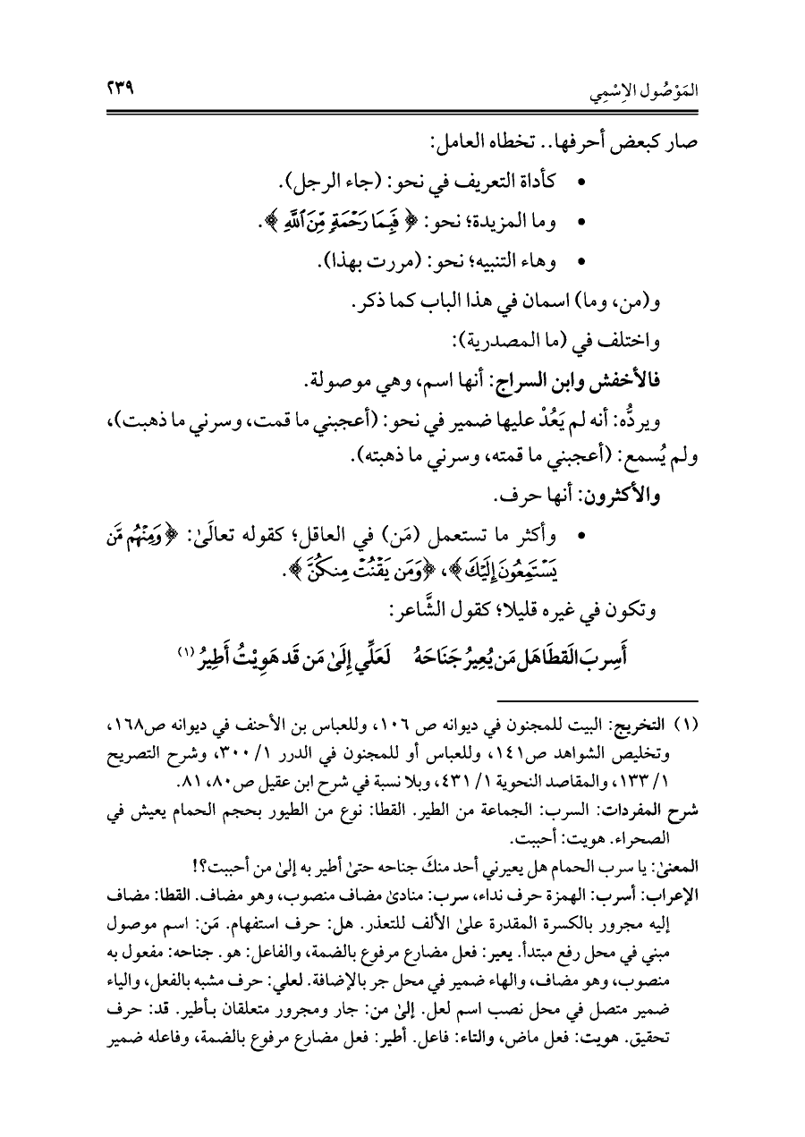 الإعراب: أسرب: الهمزة حرف نداء، سرب: منادى مضاف منصوب، وهو مضاف. القطا: مضاف إليه مجرور بالكسرة المقدرة على الألف للتعذر. هل: حرف استفهام. مَن: اسم موصول مبني في محل رفع مبتدأ. يعبر: فعل مضارع مرفوع بالضمة، والفاعل: هو. جناحه: مفعول به منصوب، وهو مضاف، والهاء ضمير في محل جر بالإضافة. لعلي: حرف مشبه بالفعل، والياء ضمير متصل في محل نصب اسم لعل. إلى من: جار ومجرور متعلقان بأطير. قد: حرف تحقيق. هويت: فعل ماض، والتاء: فاعل. أطير: فعل مضارع مرفوع بالضمة، وفاعله ضمير