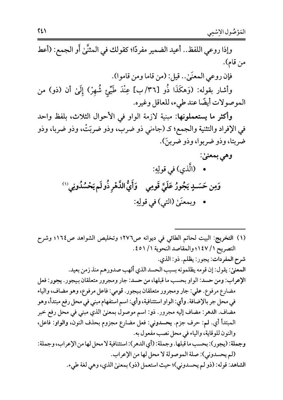 الشاهد: قوله: (ذو لم يحسدوني)؛ حيث استعمل (ذو) بمعنى الذي، وهي لغة طيء.