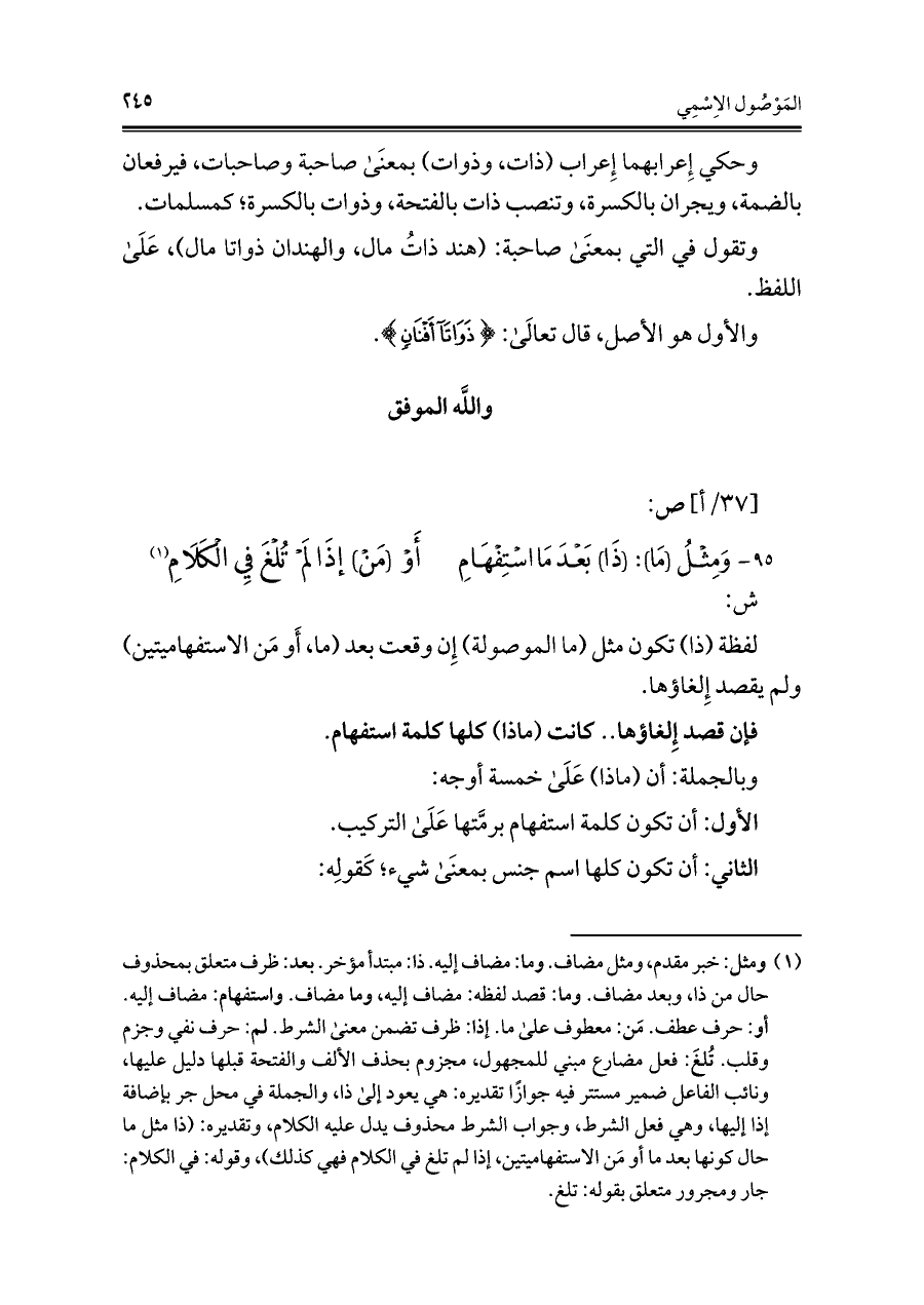 لفظة (ذا) تكون مثل (ما الموصولة) إِن وقعت بعد (ما، أَو مَن الاستفهاميتين) ولم يقصد إِلغاؤها.