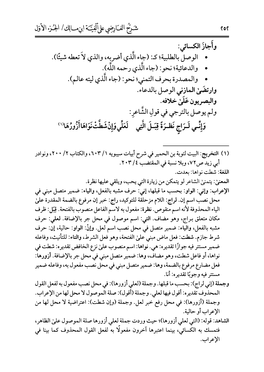 الشاهد: قوله: (التي لعلي أزورها)؛ حيث وردت جملة لعلي أزورها صلة الموصول على الظاهر، فتمسك به الكسائي، بينما اعتبرها آخرون مفعولًا به لفعل القول المحذوف كما بينا في الإعراب.