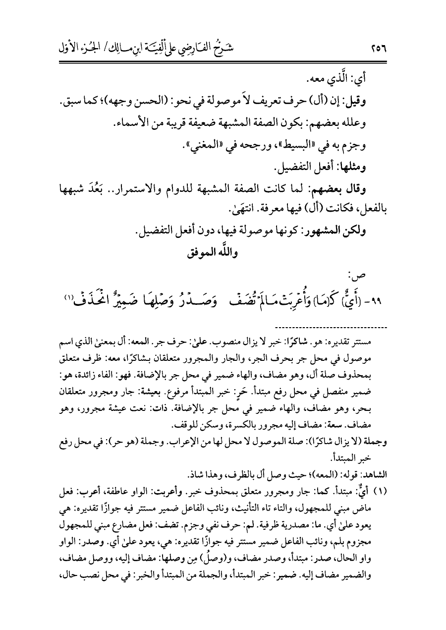 ٩٩ - (أَيٌّ) كَـ (مَا) وَأُعْرِبَتْ مَا لَمْ تُضَفْ ... وَصَدْرُ وَصْلِهَا ضَمِيْرٌ انْحَذَفْ (¬١)