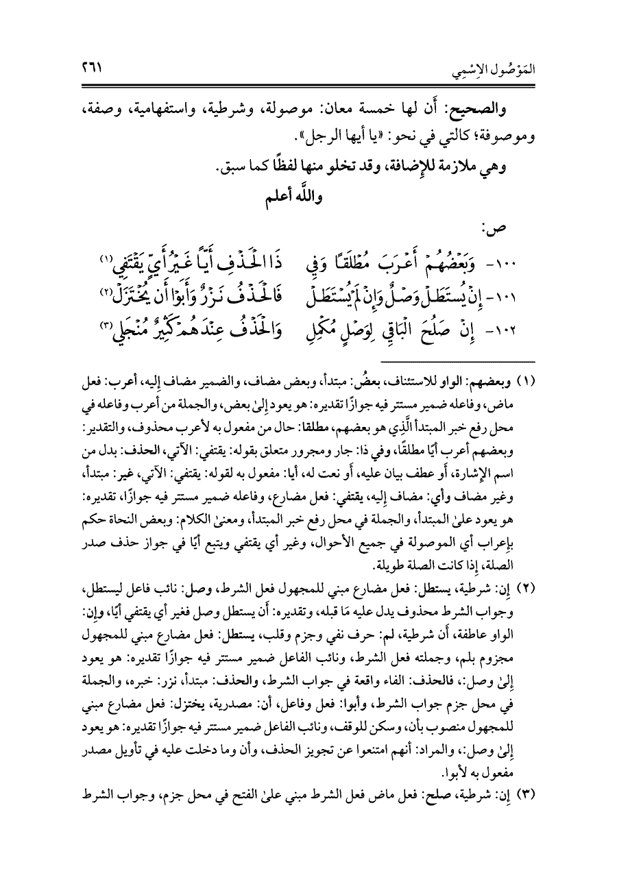 (¬١) وبعضهم: الواو للاستئناف، بعضُ: مبتدأ، وبعض مضاف، والضمير مضاف إِليه، أعرب: فعل ماض، وفاعله ضمير مستتر فيه جوازًا تقديره: هو يعود إِلى بعض، والجملة من أعرب وفاعله في محل رفع خبر المبتدأ الَّذِي هو بعضهم، مطلقا: حال من مفعول به لأعرب محذوف، والتقدير: وبعضهم أعرب أيًا مطلقًا، وفي ذا: جار ومجرور متعلق بقوله: يقتفي: الآتي، الحذف: بدل من اسم الإِشارة، أَو عطف بيان عليه، أَو نعت له، أيا: مفعول به لقوله: يقتفي: الآتي، غير: مبتدأ، وغير مضاف وأي: مضاف إِليه، يقتفي: فعل مضارع، وفاعله ضمير مستتر فيه جوازًا، تقديره: هو يعود على المبتدأ، والجملة في محل رفع خبر المبتدأ، ومعنى الكلام: وبعض النحاة حكم بإِعراب أي الموصولة في جميع الأحوال، وغير أي يقتفي ويتبع أيًا في جواز حذف صدر الصلة، إِذا كانت الصلة طويلة.