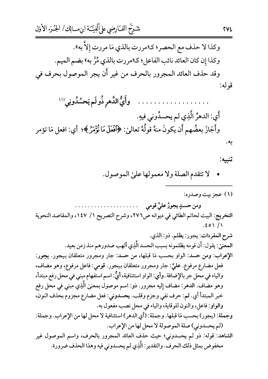 الشاهد: قوله: ذو لم يحسدوني؛ حيث حذف العائد المجرور بالحرف، واسم الموصول غير مخفوض بمثل ذلك الحرف. والتقدير: الَّذِي لم يحسدوني فيه وهذا الحذف ضرورة.