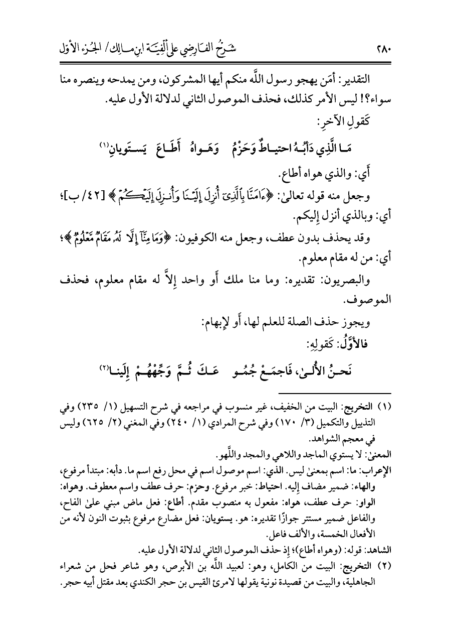 الشاهد: قوله: (وهواه أطاع)؛ إذ حذف الموصول الثاني لدلالة الأول عليه.