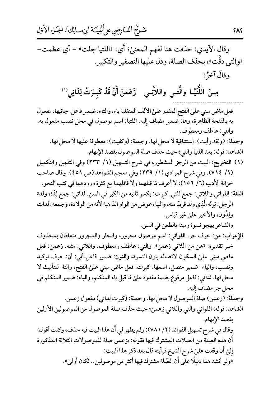 مِنَ اللُّتَيَّا والَّتي واللَّاتِي ... زَعَمْنَ أَنْ قَدْ كَبِرَتْ لِدَاتِي (¬١)