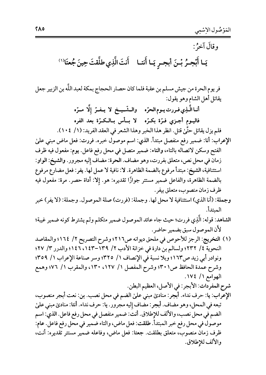 الإِعراب: أنا: ضمير رفع منفصل مبتدأ. الذي: اسم موصول خبره. فررت: فعل ماض مبني على الفتح وسكن لاتصاله بالتاء، والتاء: ضمير متصل في محل رفع فاعل. يوم: مفعول فيه ظرف زمان في محل نص، متعلق بفررت، وهو مضاف. الحرة: مضاف إِليه مجرور. والشيخ: الواو: استئنافية، الشيخ: مبتدأ مرفوع بالضمة الظاهرة. لا: نافية لا عمل لها. يفر: فعل مضارع مرفوع بالضمة الظاهرة، والفاعل ضمير مستتر جوازًا تقديره: هو. إِلا: أداة حصر. مرة: مفعول فيه ظرف زمان منصوب، متعلق بيفر.