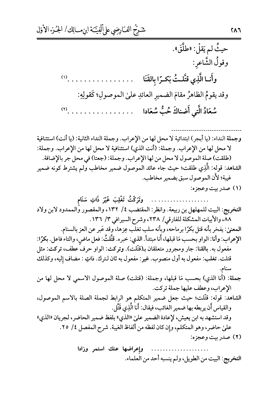 الشاهد: قوله: قتّلت؛ حيث جعل ضمير المتكلم هو الرابط لجملة الصلة بالاسم الموصول، والقياس أَن يربطه بها ضمير الغائب، فيقال: أَنا الَّذِي قَتَّل.