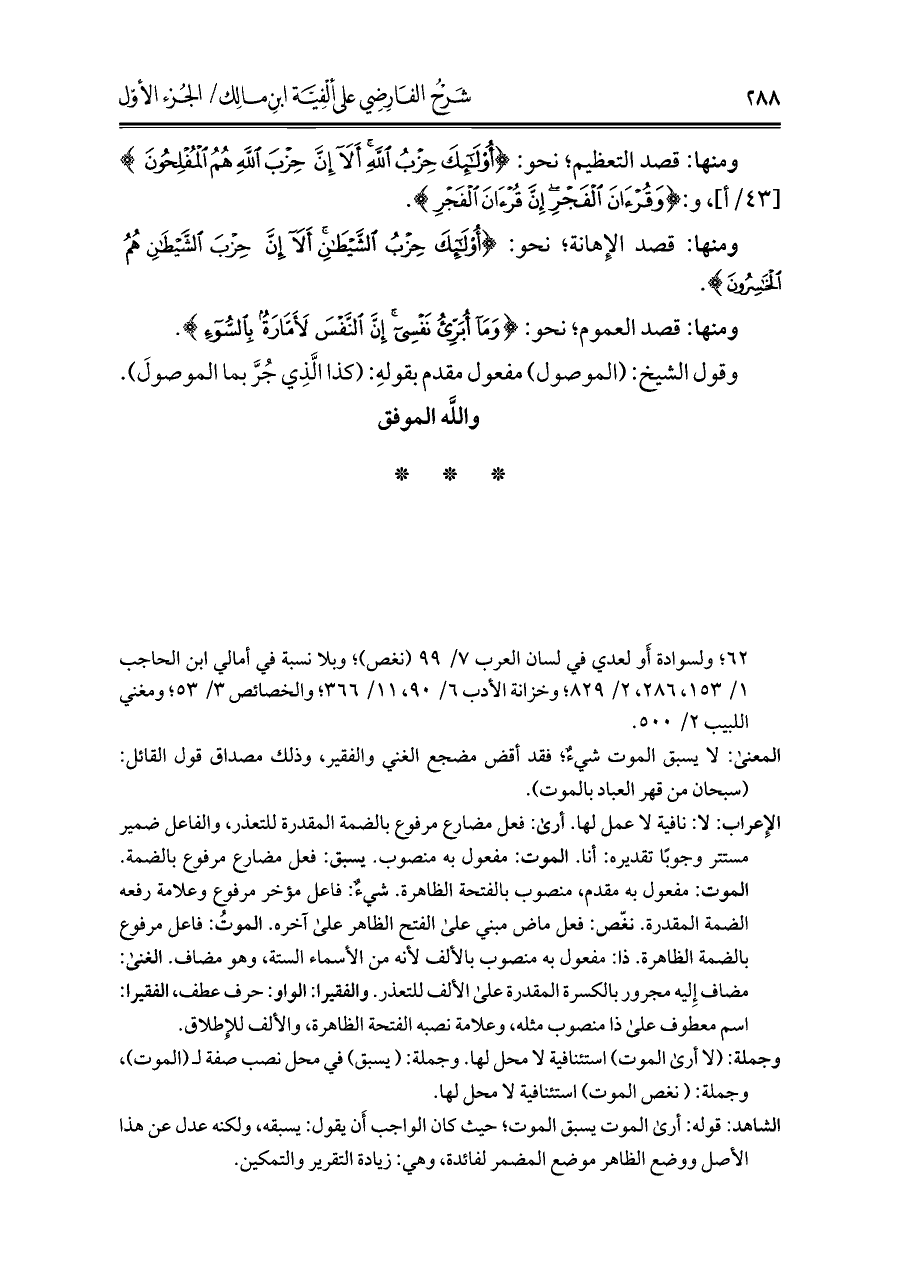 الإِعراب: لا: نافية لا عمل لها. أرى: فعل مضارع مرفوع بالضمة المقدرة للتعذر، والفاعل ضمير مستتر وجوبًا تقديره: أنا. الموت: مفعول به منصوب. يسبق: فعل مضارع مرفوع بالضمة. الموت: مفعول به مقدم، منصوب بالفتحة الظاهرة. شيءٌ: فاعل مؤخر مرفوع وعلامة رفعه الضمة المقدرة. نغّص: فعل ماض مبني على الفتح الظاهر على آخره. الموتُ: فاعل مرفوع بالضمة الظاهرة. ذا: مفعول به منصوب بالألف لأنه من الأسماء الستة، وهو مضاف. الغنى: مضاف إِليه مجرور بالكسرة المقدرة على الألف للتعذر. والفقيرا: الواو: حرف عطف، الفقيرا: اسم معطوف على ذا منصوب مثله، وعلامة نصبه الفتحة الظاهرة، والألف للإِطلاق.