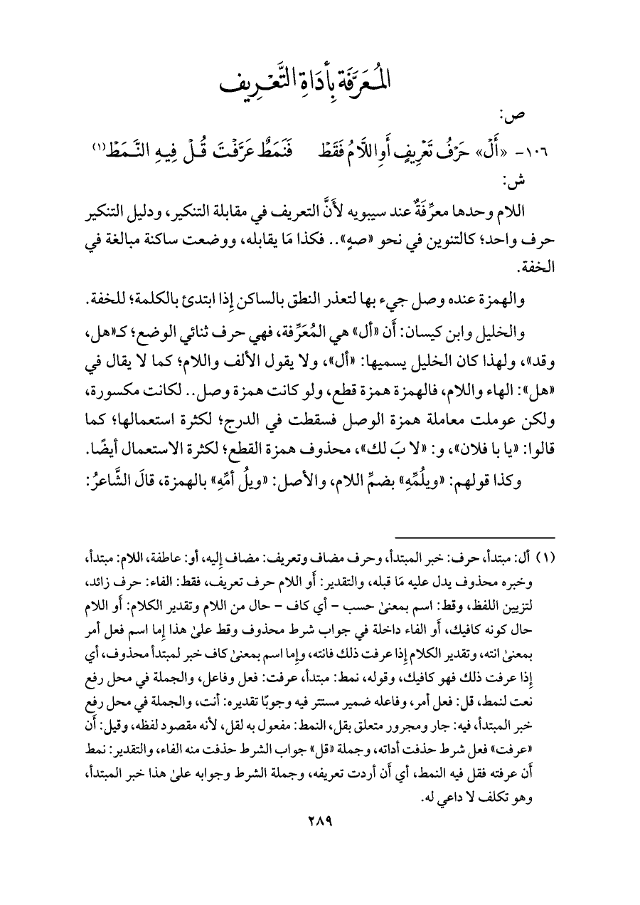 ١٠٦ - "أَلْ" حَرْفُ تَعْرِيفٍ أَوِ اللَّامُ فَقَطْ ... فَنَمَطٌ عَرَّفْتَ قُلْ فِيهِ النَّمَطْ (¬١)
