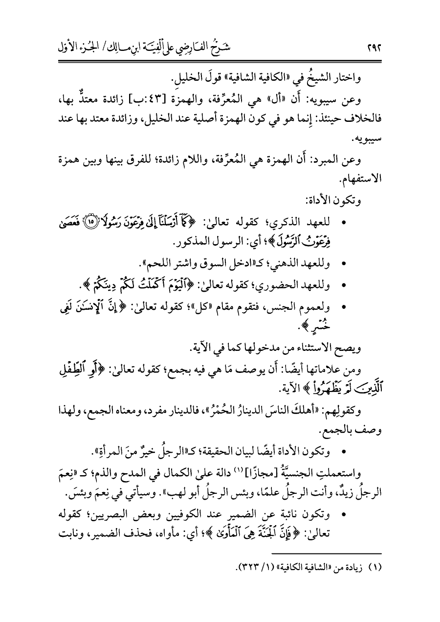 وعن سيبويه: أَن "أل" هي المُعرِّفة، والهمزة زائدة معتدٌّ بها، فالخلاف حينئذ: إِنما هو في كون الهمزة أصلية عند الخليل، وزائدة معتد بها عند سيبويه.