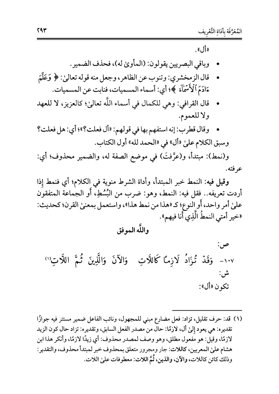 ١٠٧ - وَقَدْ تُزَادُ لَازِمًا كَاللَّاتِ ... وَالآنَ وَالَّذِينَ ثُمَّ اللَّاتِ (¬١)