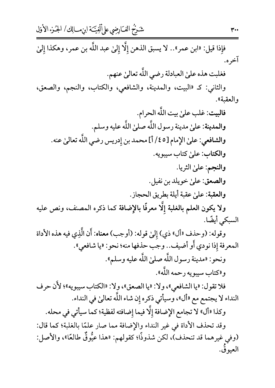 فلا تقول: "يا الشافعي"، ولا: "يا الصعق"، ولا: "الكتاب سيبويه"؛ لأَن حرف النداء لا يجتمع مع "أل"، وسيأتي ذكره إِن شاء اللَّه تعالى في النداء.