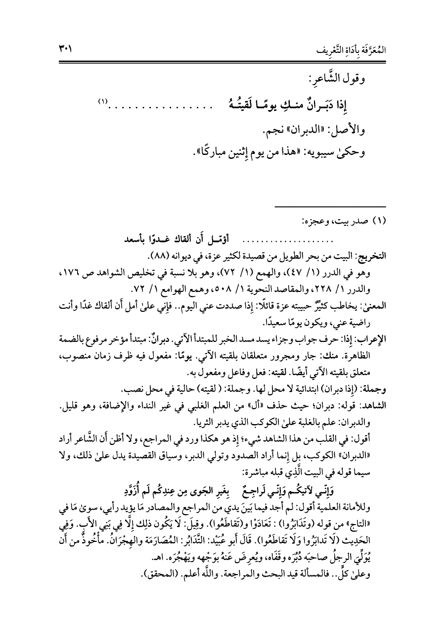 أقول: في القلب من هذا الشاهد شيء؛ إِذ هو هكذا ورد في المراجع، ولا أظن أَن الشَّاعر أراد "الدبران" الكوكب، بل إِنما أراد الصدود وتولي الدبر، وسياق القصيدة يدل على ذلك، ولا سيما قوله في البيت الَّذِي قبله مباشرة: