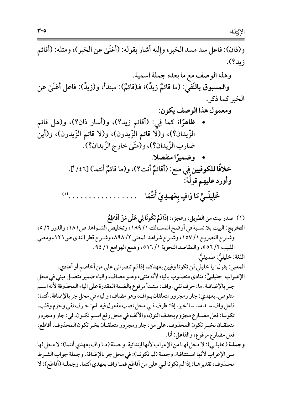 الإعراب: خليليَّ: منادى منصوب بالياء لأنه مثنى، وهو مضاف، والياء ضمير متصل مبني في محل جر بالإضافة. ما: حرف نفي. واف: مبتدأ مرفوع بالضمة المقدرة على الياء المحذوفة لأنه اسم منقوص. بعهدي: جار ومجرور متعلقان بواف، وهو مضاف، والياء في محل جر بالإضافة. أنتما: فاعل واف سد مسد الخبر. إذا: ظرف في محل نصب مفعول فيه. لم: حرف نفي وجزم وقلب. تكونا: فعل مضارع مجزوم بحذف النون، والألف في محل رفع اسم تكون. لي: جار ومجرور متعلقان بخبر تكون المحذوف. على من: جار ومجرور متعلقان بخبر تكون المحذوف. أقاطع: فعل مضارع مرفوع، والفاعل: أنا.