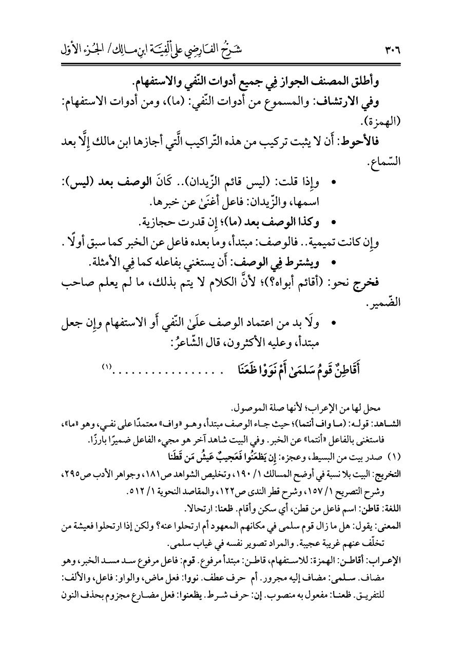 • ولَا بد من اعتماد الوصف علَى النّفي أَو الاستفهام وإِن جعل مبتدأ، وعليه الأكثرون، قال الشّاعرُ: