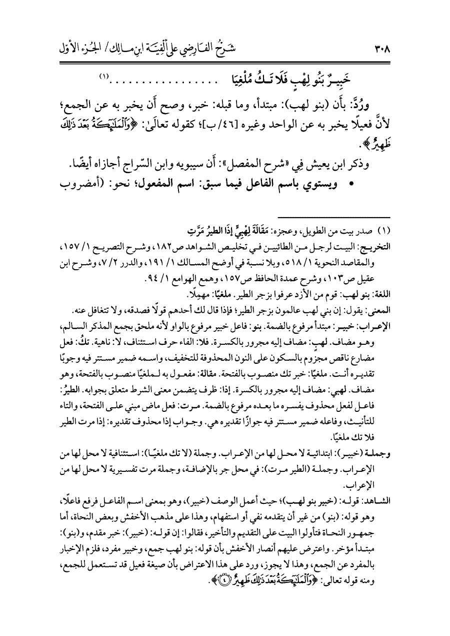 الشاهد: قوله: (خبير بنو لهب)؛ حيث أعمل الوصف (خبير)، وهو بمعنى اسم الفاعل فرفع فاعلًا، وهو قوله: (بنو) من غير أن يتقدمه نفي أو استفهام، وهذا على مذهب الأخفش وبعض النحاة، أما جمهور النحاة فتأولوا البيت على التقديم والتأخير، فقالوا: إن قوله: (خبير): خبر مقدم، و (بنو): مبتدأ مؤخر. واعترض عليهم أنصار الأخفش بأن قوله: بنو لهب جمع، وخبير مفرد، فلزم الإخبار بالمفرد عن الجمع، وهذا لا يجوز، ورد على هذا الاعتراض بأن صيغة فعيل قد تستعمل للجمع، ومنه قوله تعالى: {وَالْمَلَائِكَةُ بَعْدَ ذَلِكَ ظَهِيرٌ}.