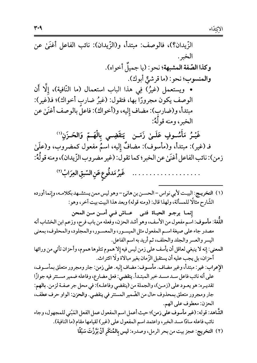 الشاهد: قوله: (غير مأسوف على زمن)؛ حيث أعمل اسم المفعول عمل الفعل المَبْني للمجهول، وجاء نائب فاعله سادًا مسد الخبر، واعتمد اسم المفعول على (غير) لقيامها مقام (ما النافية).