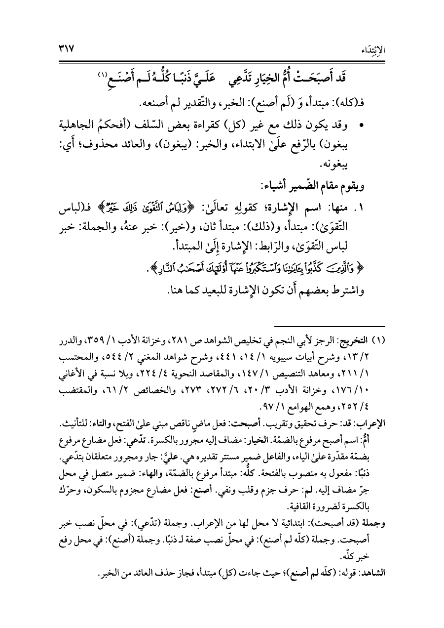 الإعراب: قد: حرف تحقيق وتقريب. أصبحت: فعل ماضٍ ناقص مبني على الفتح، والتاء: للتأنيث. أمُّ: اسم أصبح مرفوع بالضمّة. الخيارة مضاف إليه مجرور بالكسرة. تدّعي: فعل مضارع مرفوع بضمّة مقدّرة على الياء، والفاعل ضمير مستتر تقديره هي. عليَّ: جار ومجرور متعلقان بتدّعي. ذنبًا: مفعول به منصوب بالفتحة. كلُّه: مبتدأ مرفوع بالضمّة، والهاء: ضمير متصل في محل جرّ مضاف إليه. لم: حرف جزم وقلب ونفي. أصنع: فعل مضارع مجزوم بالسكون، وحرّك بالكسرة لضرورة القافية.
