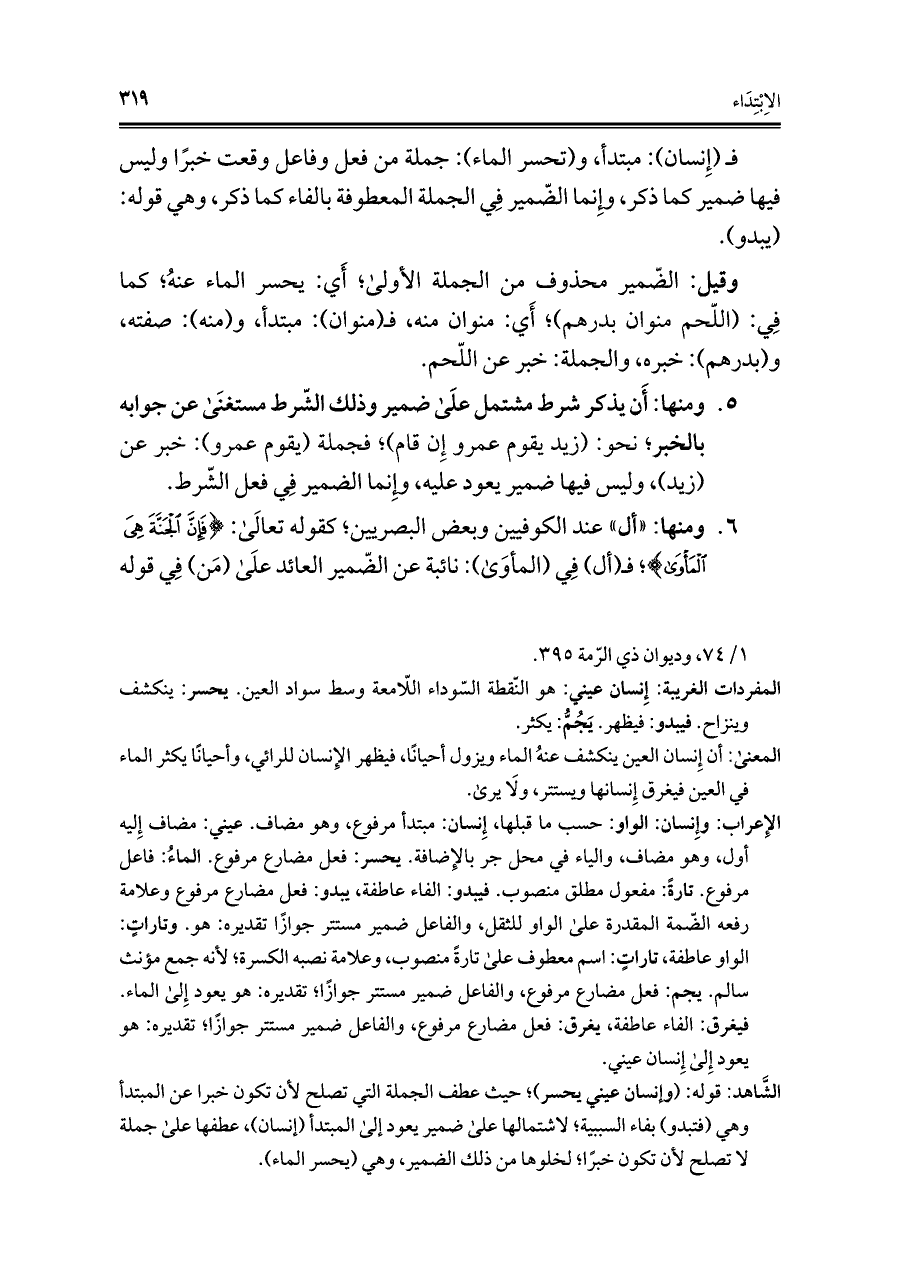الشاهد: قوله: (وإنسان عيني يحسر)؛ حيث عطف الجملة التي تصلح لأن تكون خبرا عن المبتدأ وهي (فتبدو) بفاء السببية؛ لاشتمالها على ضمير يعود إلى المبتدأ (إنسان)، عطفها على جملة لا تصلح لأن تكون خبرًا؛ لخلوها من ذلك الضمير، وهي (يحسر الماء).