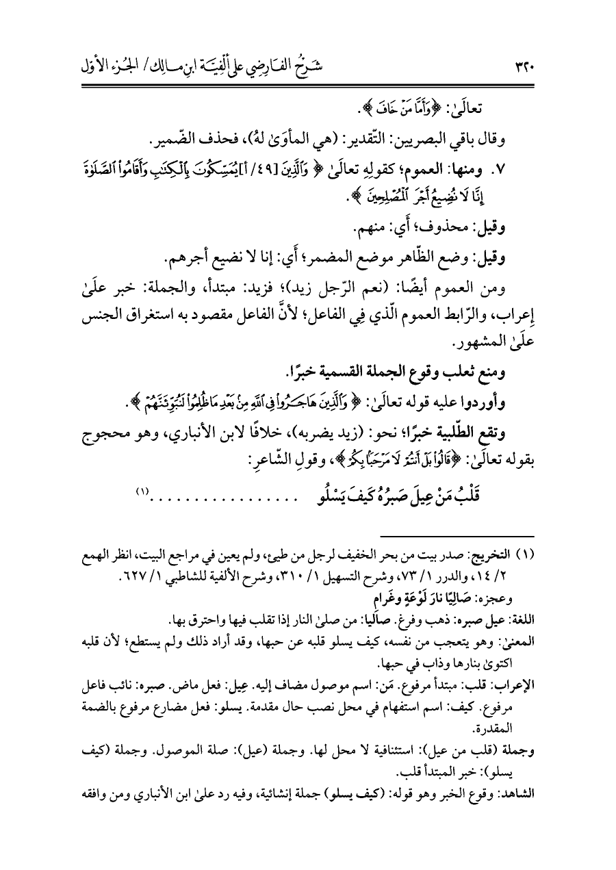 الإعراب: قلب: مبتدأ مرفوع. مَن: اسم موصول مضاف إليه. عِيل: فعل ماض. صبره: نائب فاعل مرفوع. كيف: اسم استفهام في محل نصب حال مقدمة يسلو: فعل مضارع مرفوع بالضمة المقدرة.