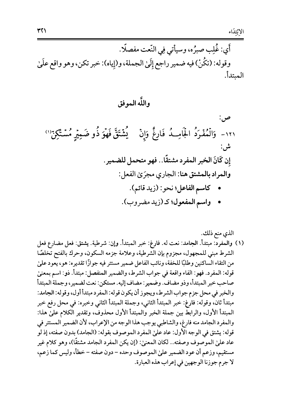 (¬١) والمفرد: مبتدأ. الجامد: نعت له. فارغ: خبر المبتدأ. وإن شرطية. يشتق: فعل مضارع فعل الشرط مبني للمجهول، مجزوم بإن الشرطية، وعلامة جزمه السكون، وحرك بالفتح تخلصًا من التقاء الساكنين وطلبًا للخفة، ونائب الفاعل ضمير مستتر فيه جوازًا تقديره: هو، يعود على قوله: المفرد. فهو: الفاء واقعة في جواب الشرط، والضيير المنفصل: مبتدأ. ذو: اسم بمعنى صاحب خبر المبتدأ، وذو مضاف. وضمير: مضاف إليه. مستكن: نعت لضمير، وجملة المبتدأ والخبر في محل جزم جواب الشرط، ويجوز أن يكون قوله: المفرد مبتدأ أول، وقوله: الجامد: مبتدأ ثان، وقوله: فارغ: خبر المبتدأ الثاني، وجملة المبتدأ الثاني وخبره: في محل رفع خبر المبتدأ الأول، والرابط بين جملة الخبر والمبتدأ الأول محذوف، وتقدير الكلام على هذا: والمفرد الجامد منه فارغ، والشاطبي يوجب هذا الوجه من الإعراب، لأن الضمير المستتر في قوله: يشتق في الوجه الأول: عاد على المفرد الموصوف بقوله: (الجامد) بدون صفته، إذ لو عاد على الموصوف وصفته .. لكان المعنى: (إن يكن المفرد الجامد مشتقًا)، وهو كلام غير مستقيم، وزعم أن عود الضمير على الموصوف وحده -دون صفته- خطأ، وليس كما زعم، لا جرم جوزنا الوجهين في إعراب هذه العبارة.