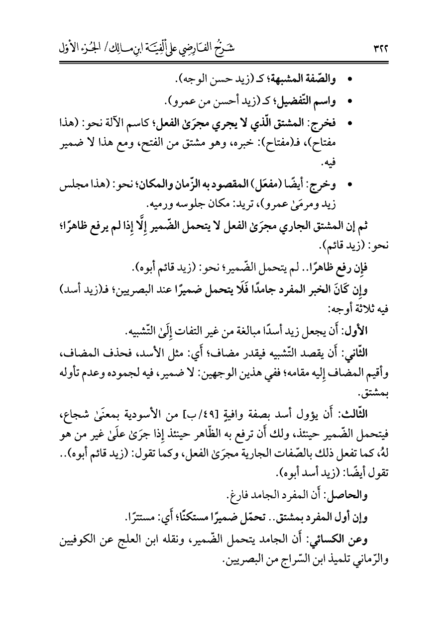 الثّالث: أَن يؤول أسد بصفة وافيةٍ من الأسودية بمعنَى شجاع، فيتحمل الضّمير حينئذ، ولك أَن ترفع به الظّاهر حينئذ إِذا جرَى علَى غير من هو لهُ، كما تفعل ذلك بالصّفات الجارية مجرَى الفعل، وكما تقول: (زيد قائم أبوه) .. تقول أيضًا: (زيد أسد أبوه).