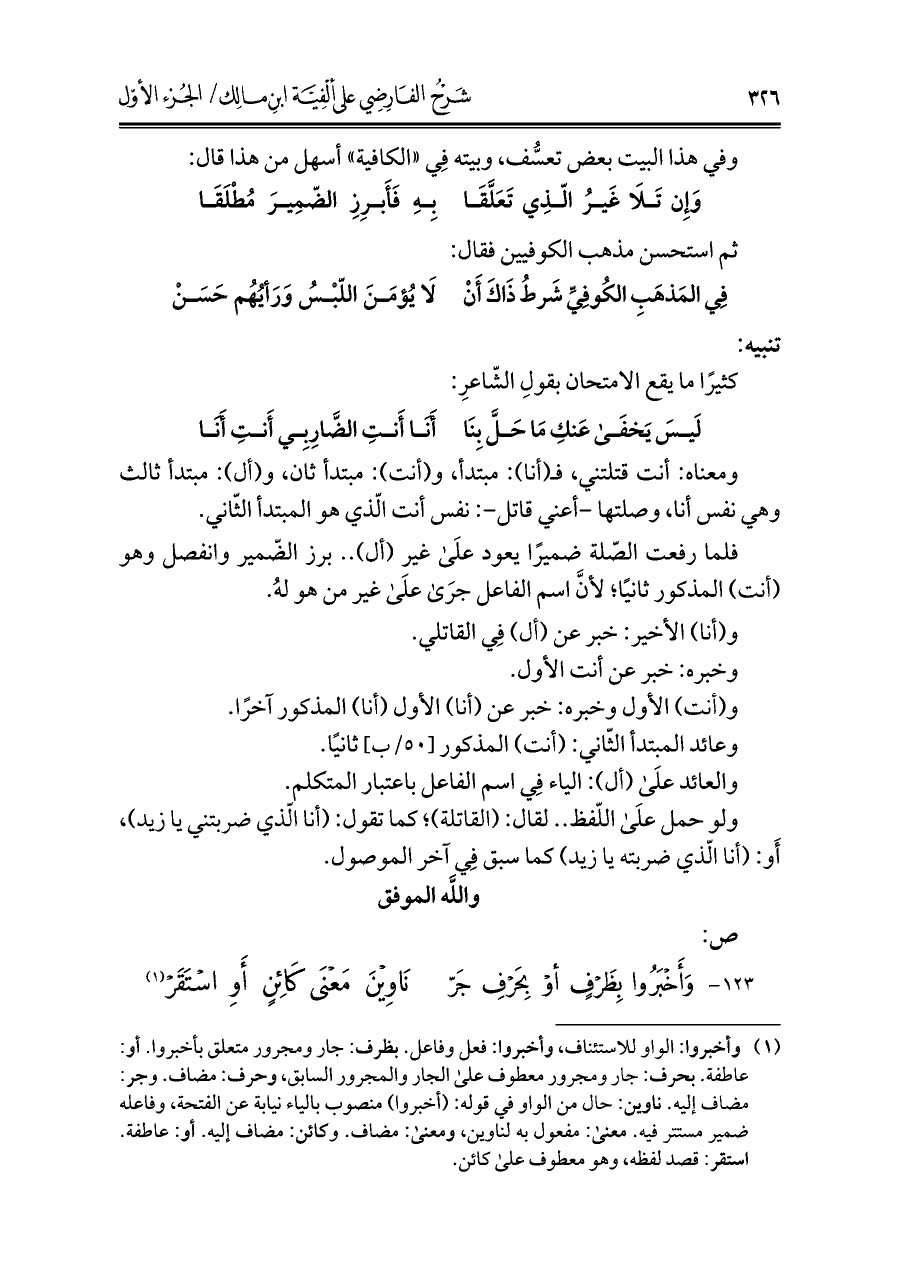 وفي هذا البيت بعض تعسُّف، وبيته فِي "الكافية" أسهل من هذا قال: