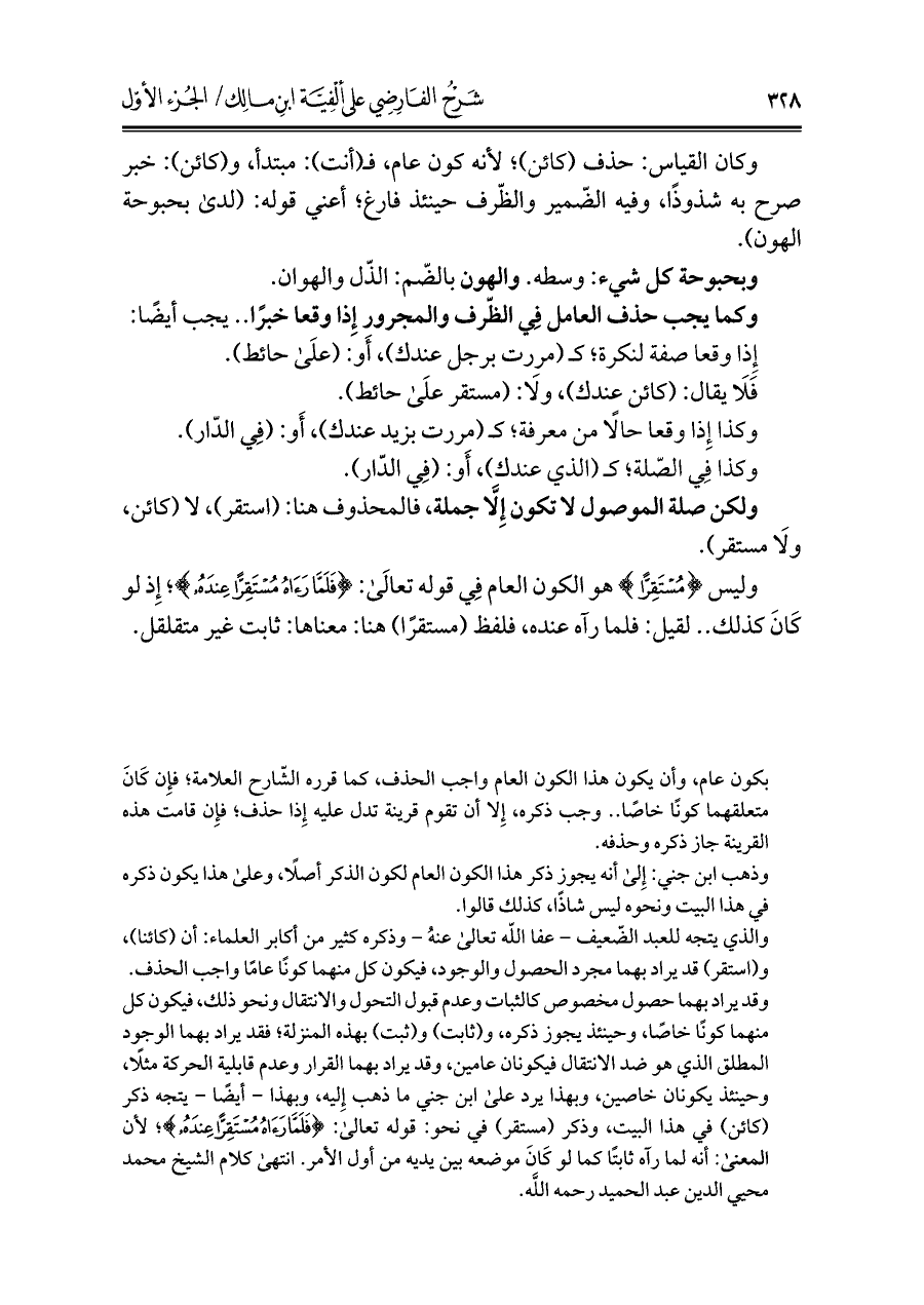 والذي يتجه للعبد الضّعيف -عفا الله تعالى عنهُ- وذكره كثير من أكابر العلماء: أن (كائنا)، و (استقر) قد يراد بهما مجرد الحصول والوجود، فيكون كل منهما كونًا عامًا واجب الحذف. وقد يراد بهما حصول مخصوص كالثبات وعدم قبول التحول والانتقال ونحو ذلك، فيكون كل منهما كونًا خاصًا، وحينئذ يجوز ذكره، و (ثابت) و (ثبت) بهذه المنزلة؛ فقد يراد بهما الوجود المطلق الذي هو ضد الانتقال فيكونان عامين، وقد يراد بهما القرار وعدم قابلية الحركة مثلًا، وحينئذ يكونان خاصين، وبهذا يرد على ابن جني ما ذهب إِليه، وبهذا -أيضًا- يتجه ذكر (كائن) في هذا البيت، وذكر (مستقر) في نحو: قوله تعالى: {فَلَمَّا رَآهُ مُسْتَقِرًّا عِنْدَهُ}؛ لأن المعنى: أنه لما رآه ثابتًا كما لو كَانَ موضعه بين يديه من أول الأمر. انتهى كلام الشيخ محمد محيي الدين عبد الحميد رحمه اللَّه.