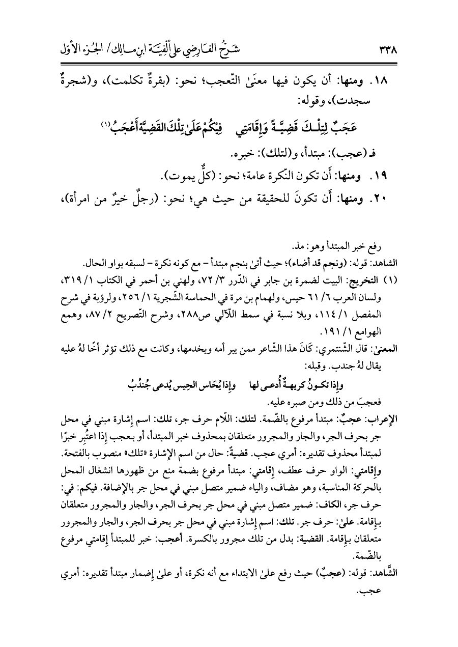 ١٨. ومنها: أن يكون فيها معنى التّعجب؛ نحو: (بقرةٌ تكلمت)، و (شجرةٌ سجدت)، وقوله: