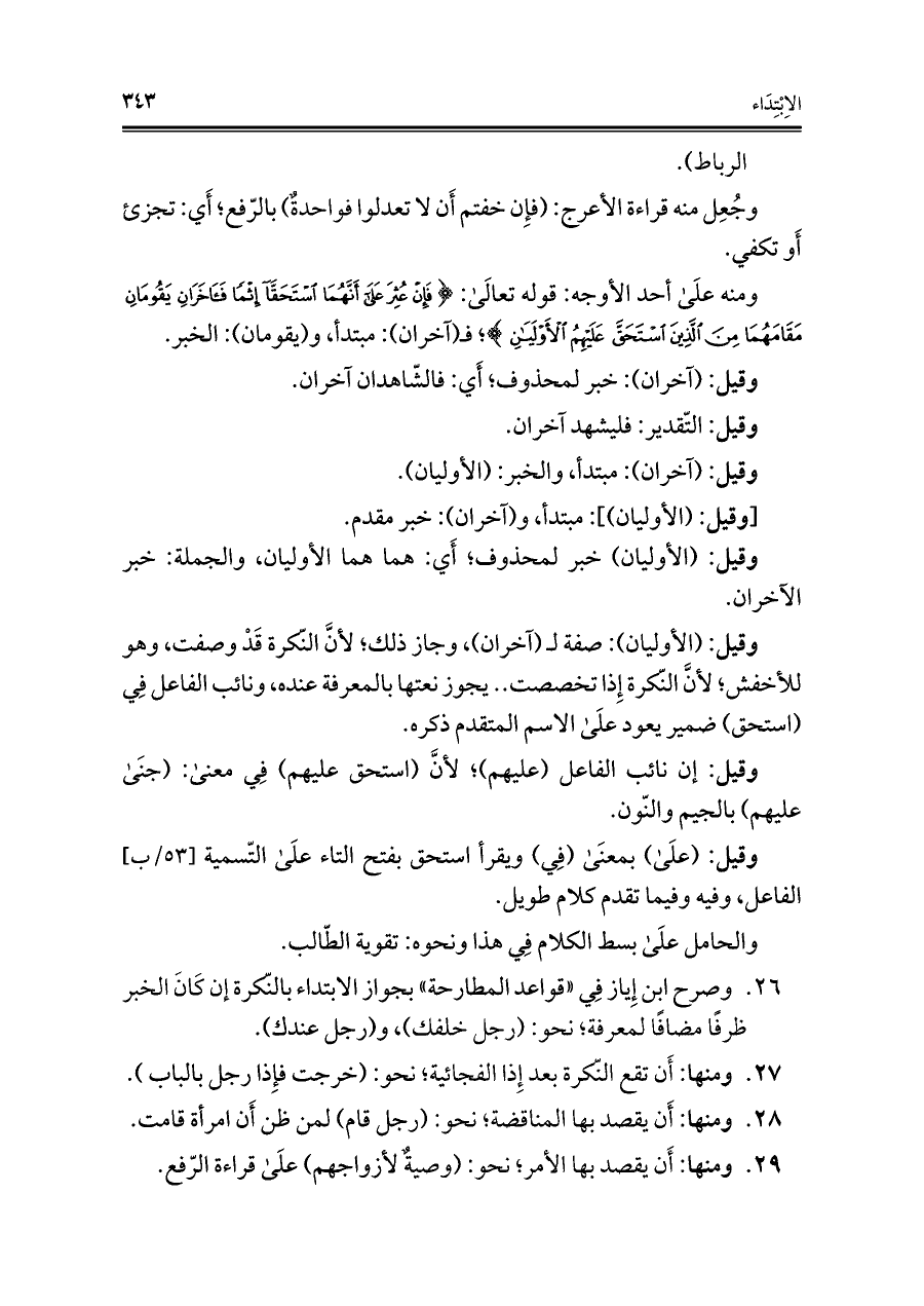 ومنه علَى أحد الأوجه: قوله تعالَى: {فَإِنْ عُثِرَ عَلَى أَنَّهُمَا اسْتَحَقَّا إِثْمًا فَآخَرَانِ يَقُومَانِ مَقَامَهُمَا مِنَ الَّذِينَ اسْتَحَقَّ عَلَيْهِمُ الْأَوْلَيَانِ}؛ فـ (آخران): مبتدأ، و (يقومان): الخبر.