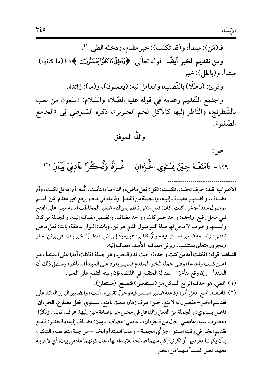 (¬٢) فامنعه: امنع: فعل أمر، وفاعله ضمير مستتر فيه وجوبًا تقديره: أنت، والضمير البارز العائد على تقديم الخبر- مفعول به لامنع. حين: ظرف زمان متعلق بامنع. يستوي: فعل مضارع. الجزءان: فاعل يستوي، والجملة من الفعل والفاعل في محل جر بإضافة حين إليها. عرفًا: تمييز. ونكرًا: معطوف عليه. عادمي: حال من الجزءان، وعادمي: مضاف. وبيان: مضاف إليه، والتقدير: فامنع تقديم الخبر في وقت استواء جزأَي الجملة -وهما المبتدأ والخبر- من جهة التعريف والتنكير، بأن يكونا معرفتين أو نكرتين كل منهما صالحة للابتداء بها، حال كونهما عادمي بيان، أي لا قرينة معهما تعين المبتدأ منهما من الخبر.