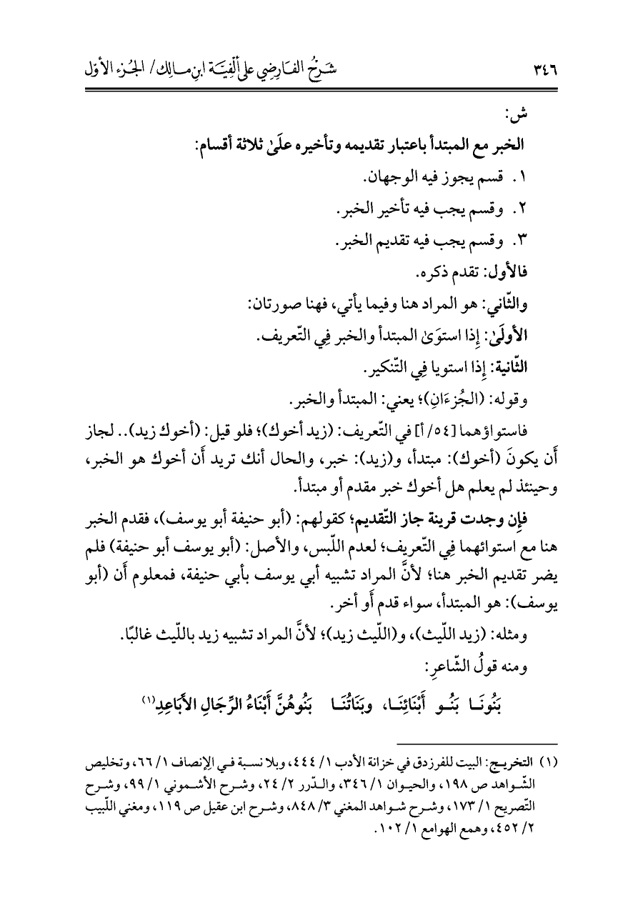 فإِن وجدت قرينة جاز التّقديم، كقولهم: (أبو حنيفة أبو يوسف)، فقدم الخبر هنا مع استوائهما فِي التّعريف؛ لعدم اللّبس، والأصل: (أبو يوسف أبو حنيفة) فلم يضر تقديم الخبر هنا؛ لأنَّ المراد تشبيه أبي يوسف بأبي حنيفة، فمعلوم أَن (أبو يوسف): هو المبتدأ، سواء قدم أَو أخر.