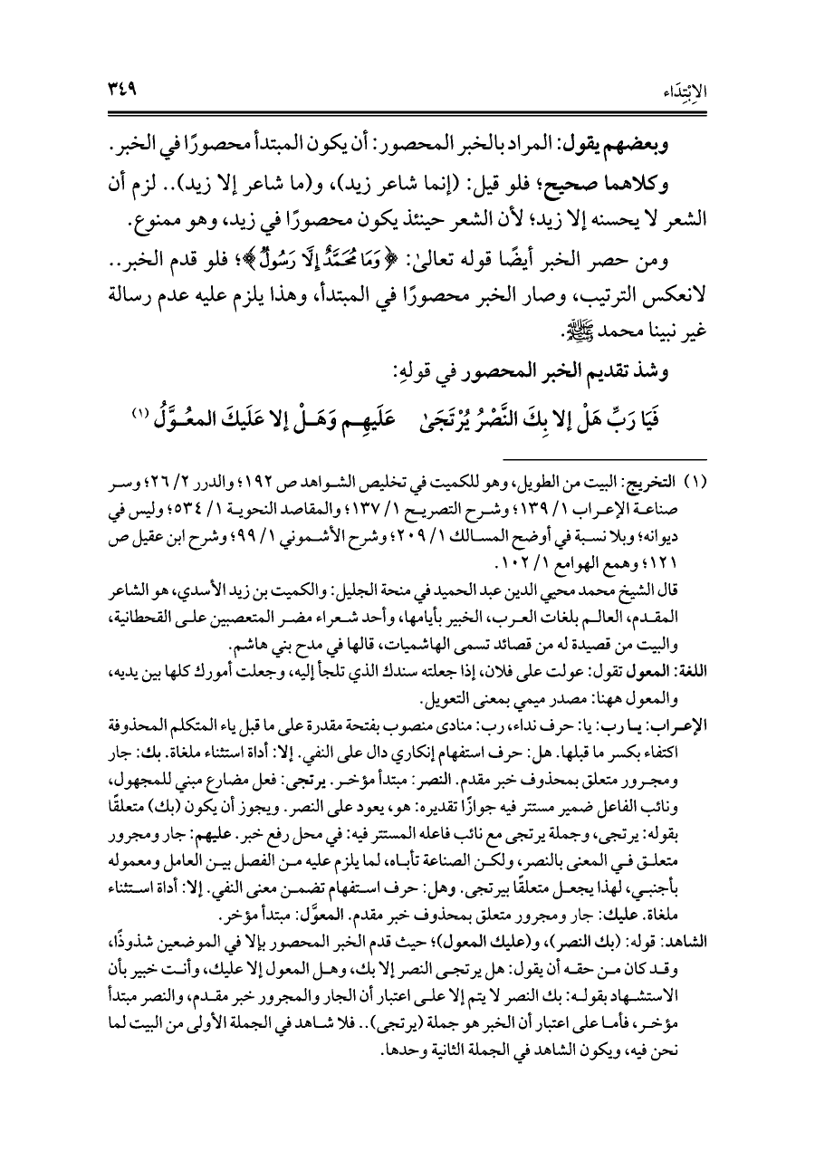 الشاهد: قوله: (بك النصر)، و (عليك المعول)؛ حيث قدم الخبر المحصور بإلا في الموضعين شذوذًا، وقد كان من حقه أن يقول: هل يرتجى النصر إلا بك، وهل المعول إلا عليك، وأنت خبير بأن الاستشهاد بقوله: بك النصر لا يتم إلا على اعتبار أن الجار والمجرور خبر مقدم، والنصر مبتدأ مؤخر، فأما على اعتبار أن الخبر هو جملة (يرتجى) .. فلا شاهد في الجملة الأولى من البيت لما نحن فيه، ويكون الشاهد في الجملة الثانية وحدها.