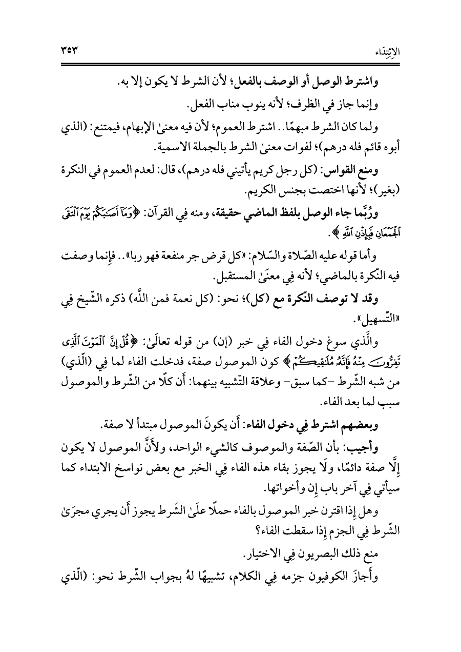 وأجيب: بأن الصّفة والموصوف كالشيء الواحد، ولأَنَّ الموصول لا يكون إِلَّا صفة دائمًا، ولَا يجوز بقاء هذه الفاء فِي الخبر مع بعض نواسخ الابتداء كما سيأتي فِي آخر باب إِن وأخواتها.