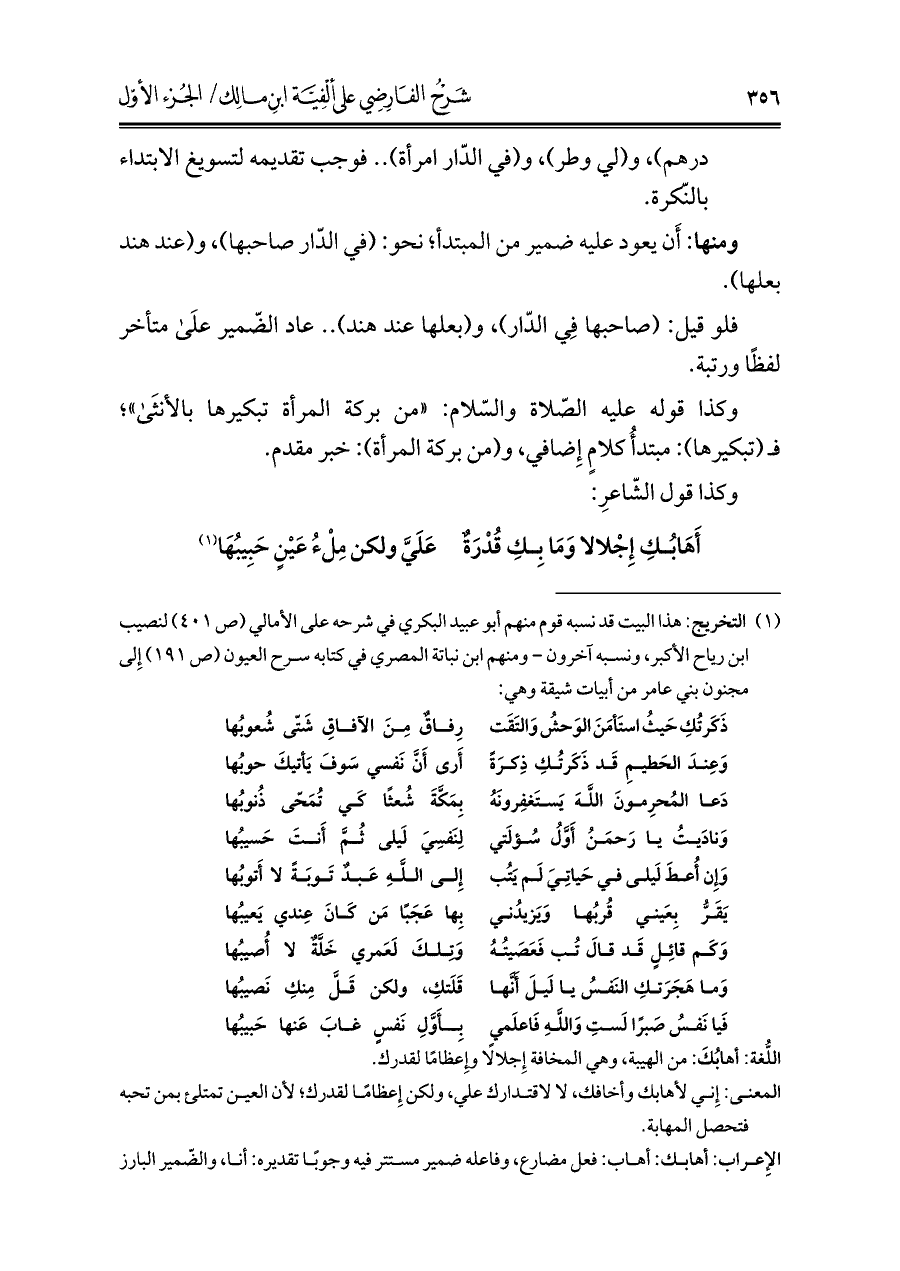 أَهَابُكِ إِجْلالا وَمَما بِكِ قُدْرَةٌ ... عَلَيَّ ولكن مِلْءُ عَيْنٍ حَبِيبُهَا (¬١)